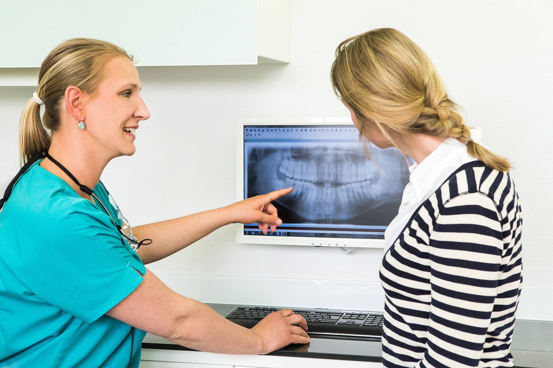 Hier arbeiten wir mit mehreren KollegInnen aus der Mund-Kiefer-Gesichtschirurgie und der Oralchirurgie zusammen. Kleinere chirurgische Eingriffe im Mundraum, wie zum Beispiel das Ziehen von Zähnen, führen wir in der Praxis durch. Bei Implantaten oder aufwendigeren Zahnentfernungen ist es ein kollegiales Zusammenspiel.